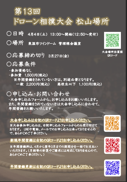 The official website of the Japan Drone Sumo Association (JDSA) https://dronesumo.net/ introduces a unique sport that combines traditional Japanese sumo wrestling with modern drone technology. What is Drone Sumo? Drone Sumo is a competitive event where spherical drones face off in a ring, aiming to push each other out, much like traditional sumo wrestling. This aerial battle offers excitement and is accessible to both beginners and experienced drone enthusiasts. "From the organizers: Let's enjoy Drone Sumo in Japan!"